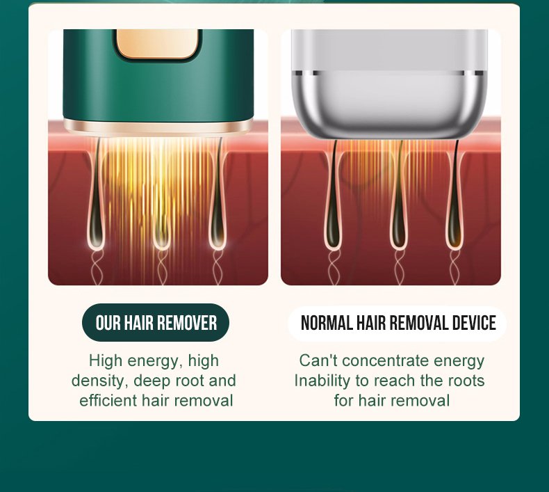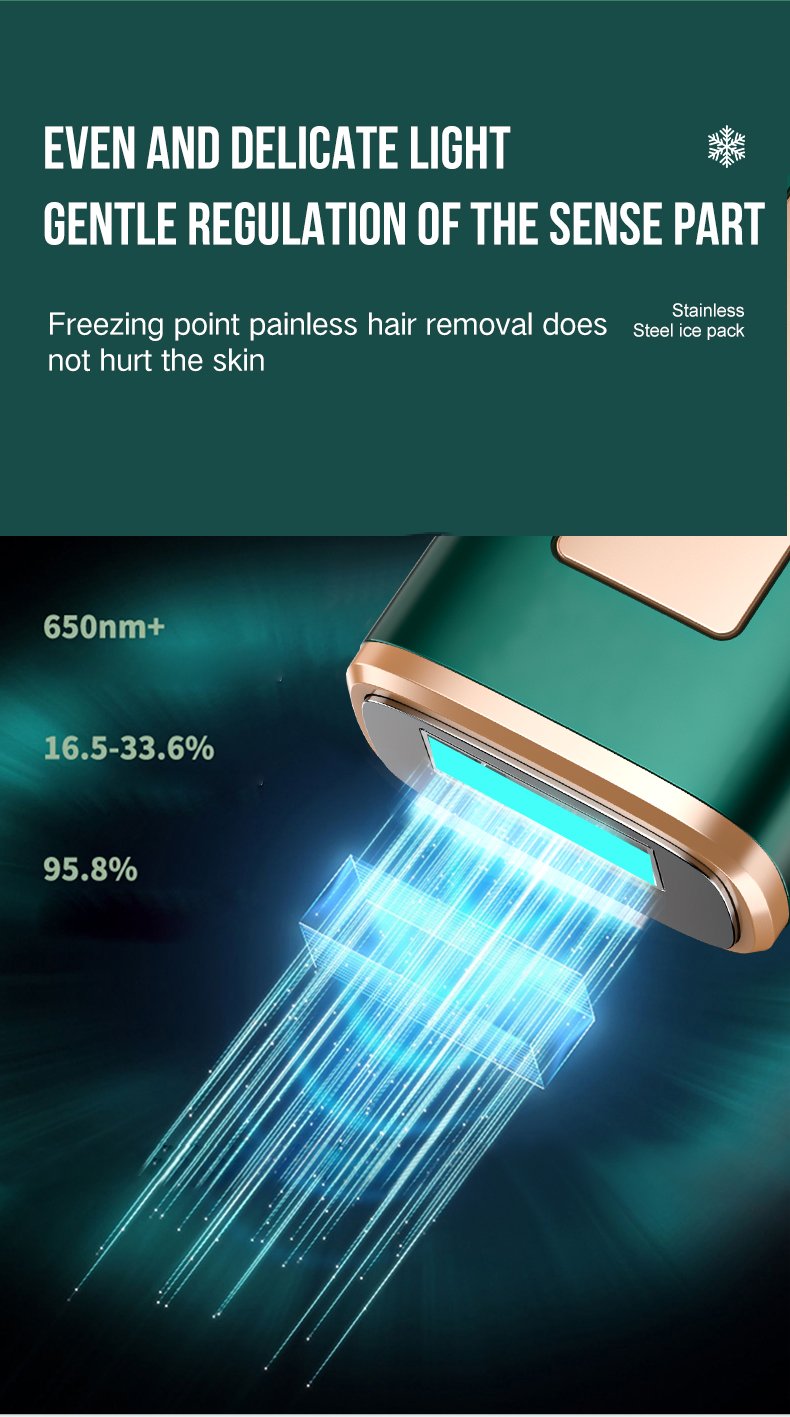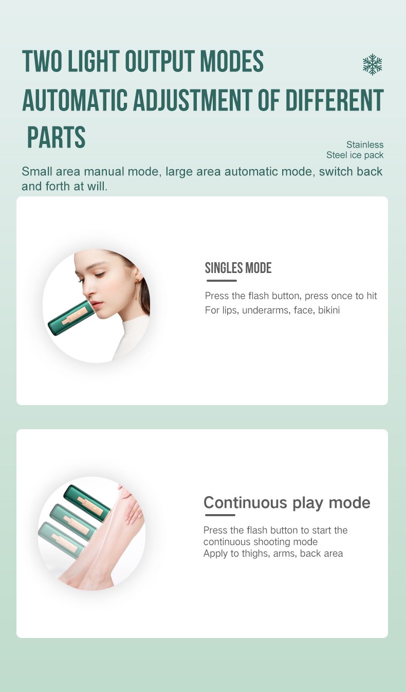 Feature: 10Hz high-speed flash, Large treatment window, 510–1200nm wavelength, Long-pulse up to 400ms, Safe for all skin tones, Unlimited flashes, 4℃ ice cooling, Painless hair removal