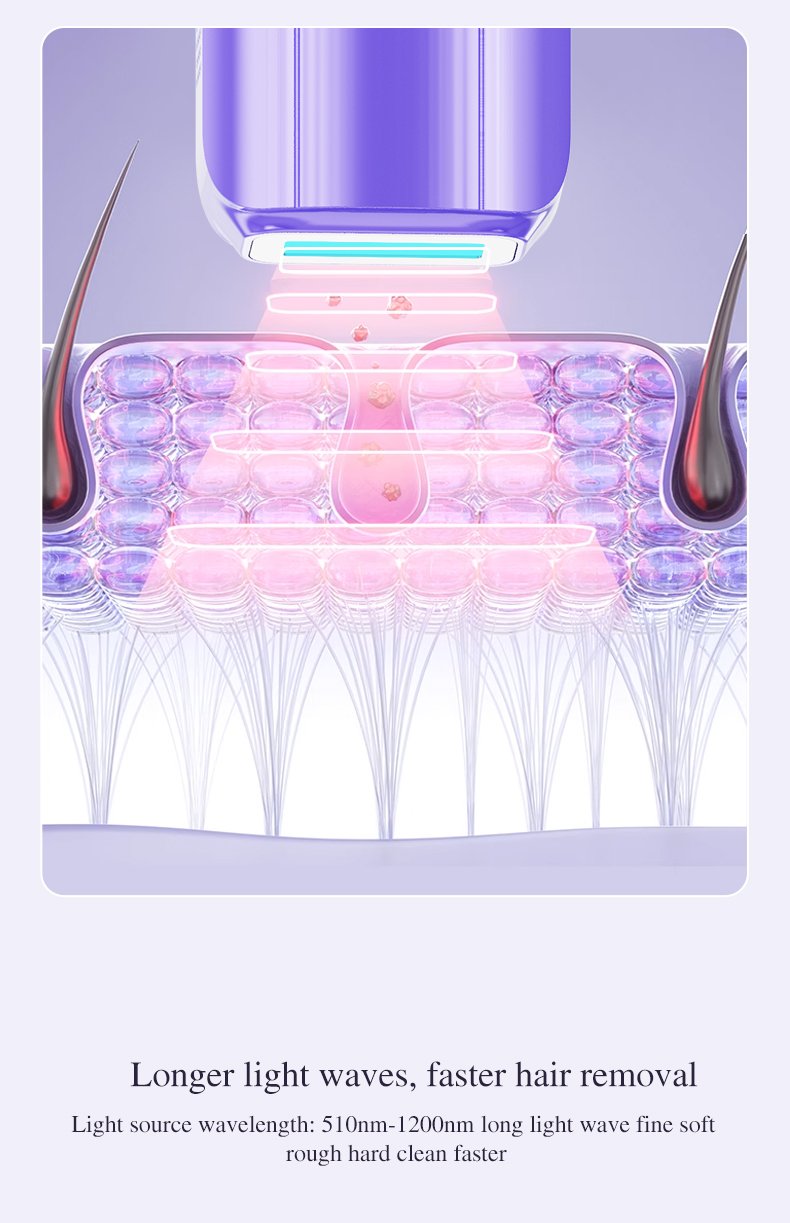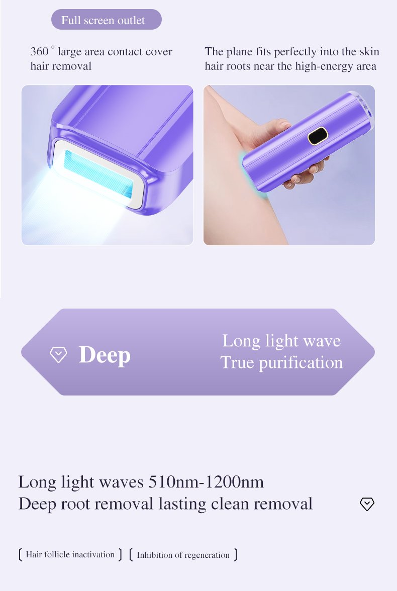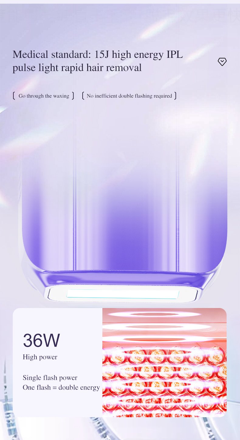 Feature: 10Hz high-speed flash, Extra-large treatment window, 510–1200nm wide spectrum, 400ms long pulse, Multi-skin tone compatibility, Unlimited flashes