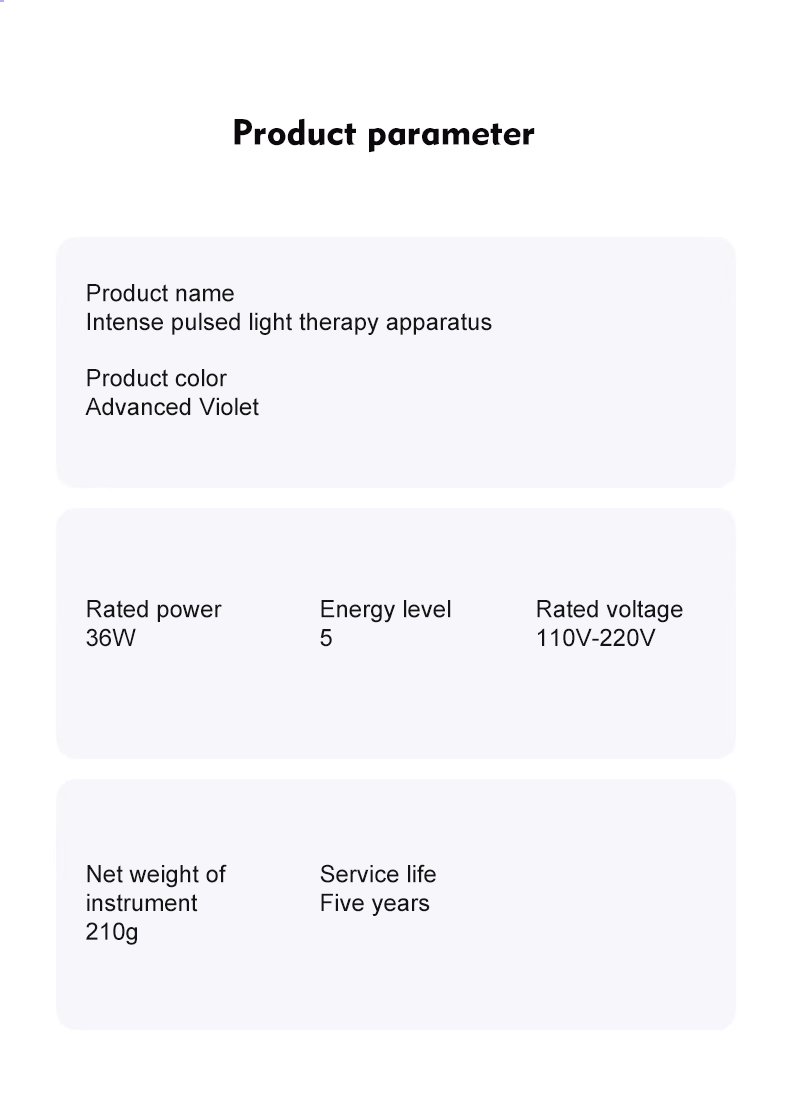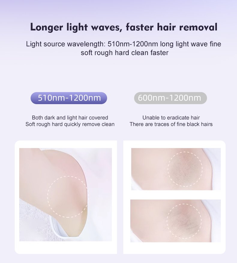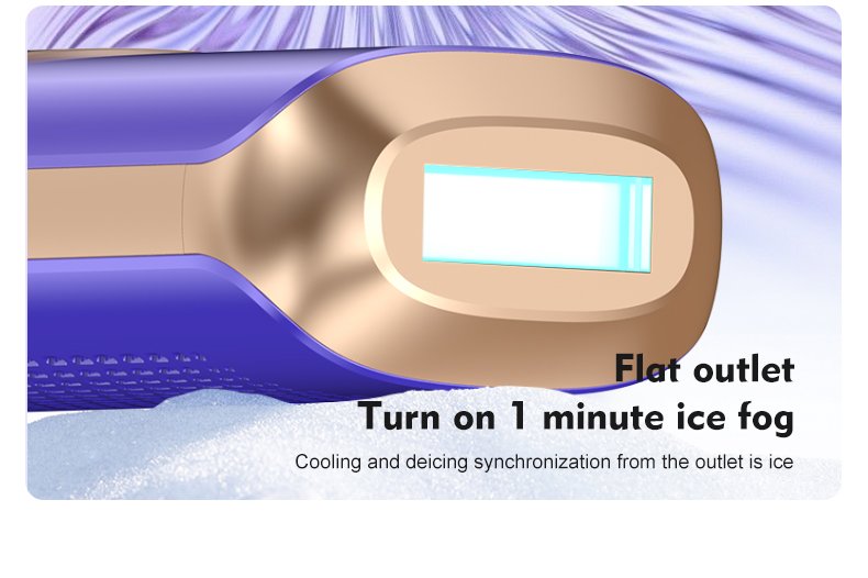 Feature: Sapphire ice cooling window, Smooth tactile shell, Integrated control panel, 10Hz high-speed flash, Large treatment window, 510–1200nm wavelength, Long-pulse up to 400ms, Ice cooling system down to 4℃, Unlimited flashes, Full cooling protection