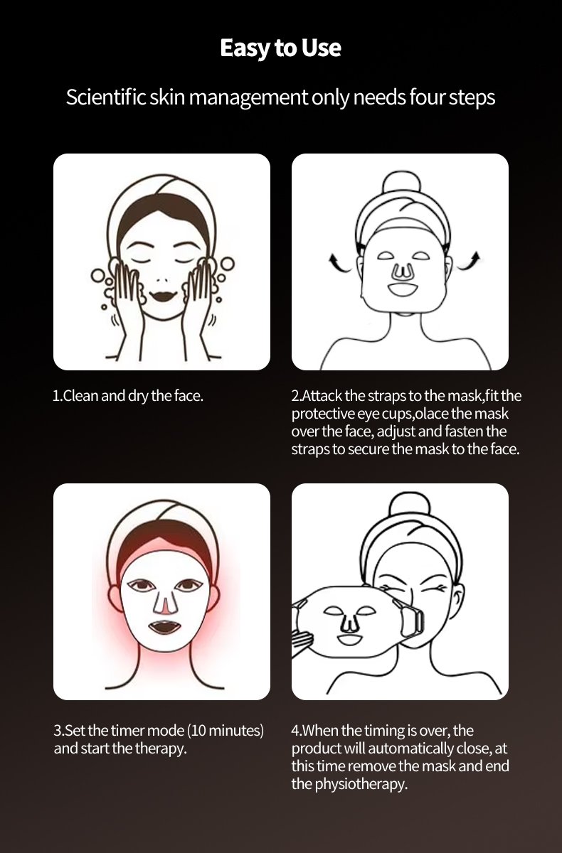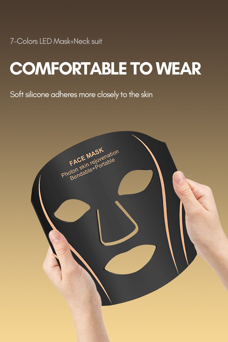 Feature: Flexible silicone mask, Face and neck dual design, 7 color LED light therapy, High-density LED chips, Bendable and portable structure, Rechargeable battery, Hands-free use