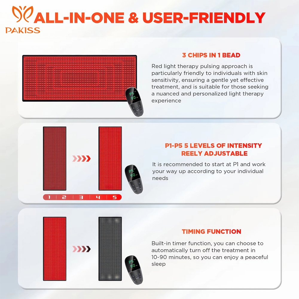 Pulsed red light technology with 3-chip LED beads delivers gentle and effective phototherapy, designed for sensitive skin and comfortable full-body use.