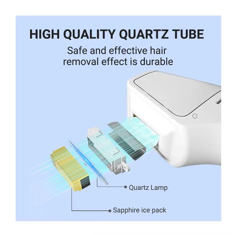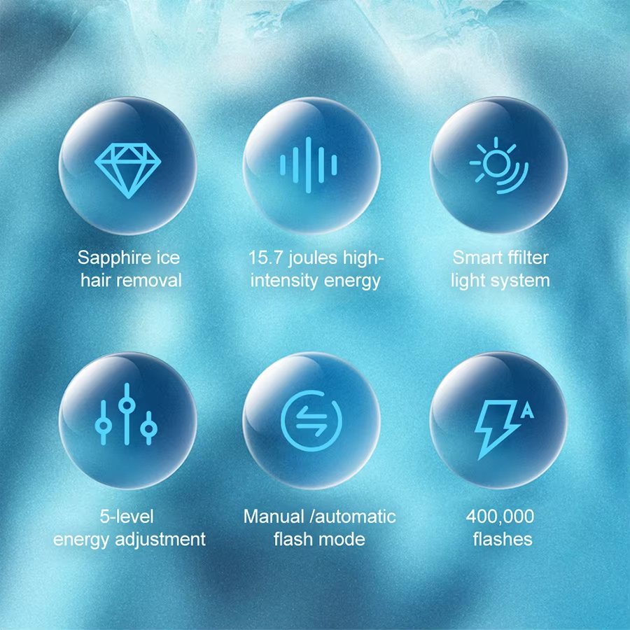 2-in-1 IPL system, Hair removal mode (HR), Skin rejuvenation mode (SR), Dual function design, Advanced IPL technology, Melanin targeting, Hair follicle inhibition, Permanent hair reduction, Clear skin effect, Quartz lamp tube, 400,000 flashes lifespan, Long-term use, ICE cooling system, Skin soothing effect, Low pain experience, Auto mode design, Hands-free operation, Manual mode control, Precise treatment, Full body usage, Home use device