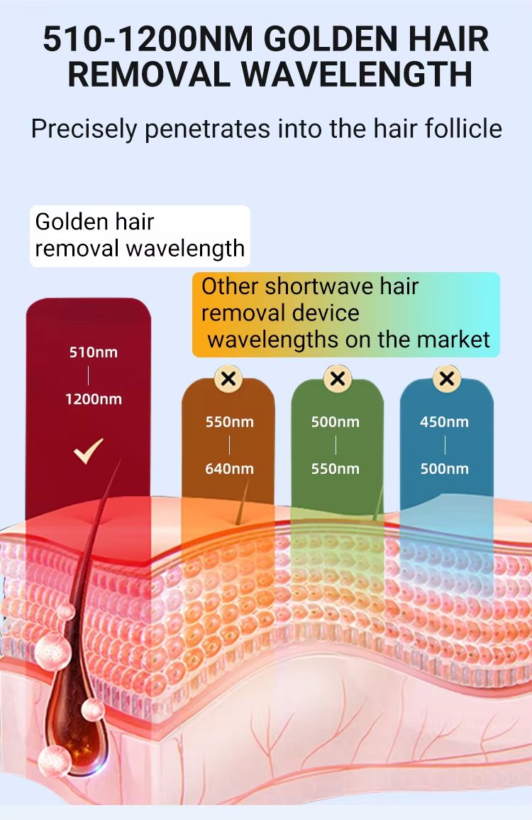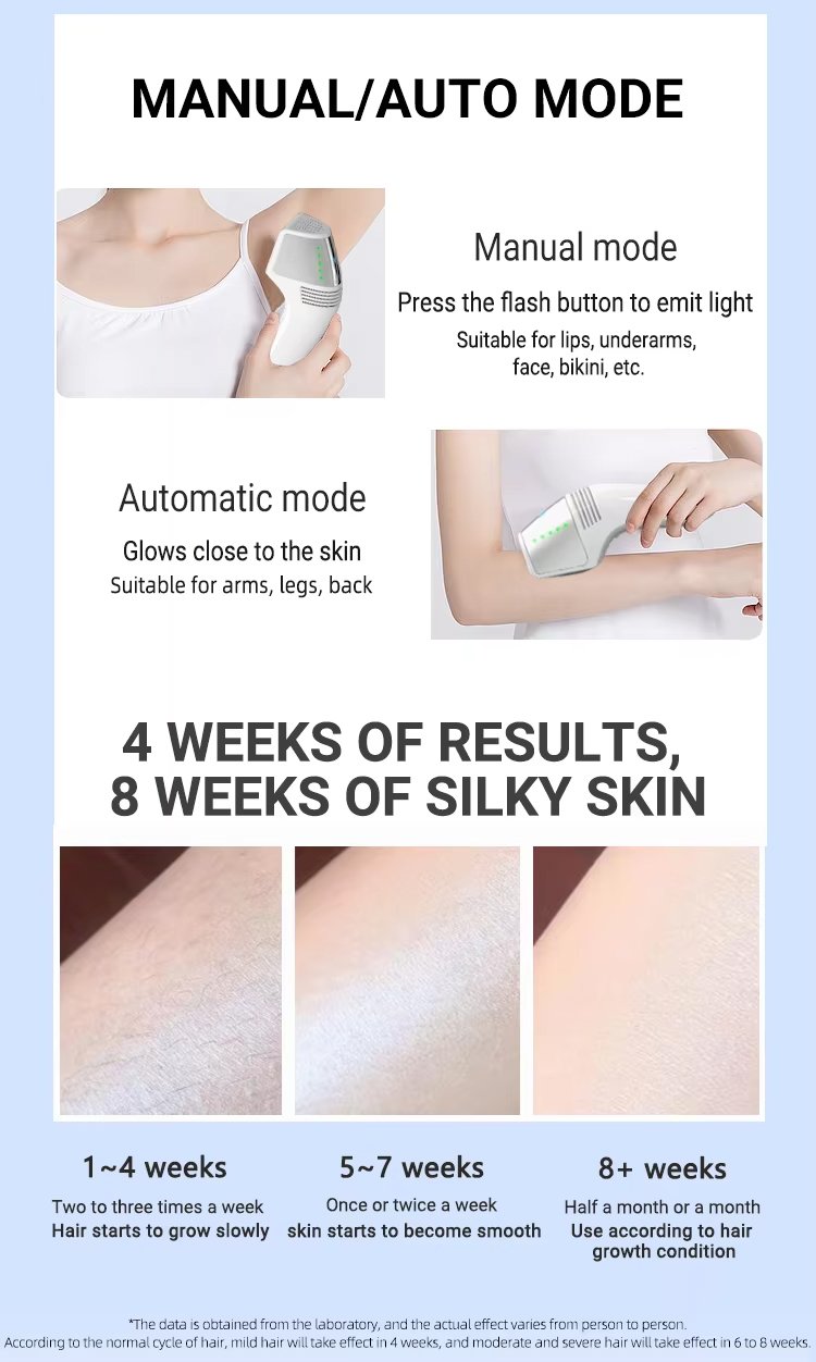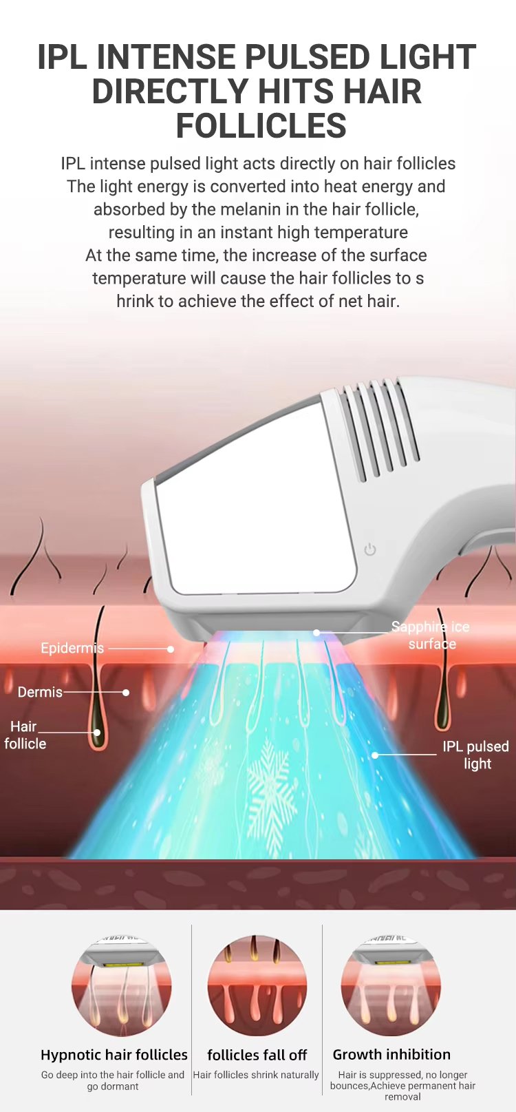 IPL hair removal, Skin rejuvenation, Hair growth inhibition, Smooth skin care, Skin soothing, Pore refinement, Skin tone improvement, Full body hair treatment, Face hair removal, Bikini hair removal, Underarm hair removal, Arm hair removal, Leg hair removal, Chest hair removal, Back hair removal, Long-term beauty maintenance, Home beauty treatment