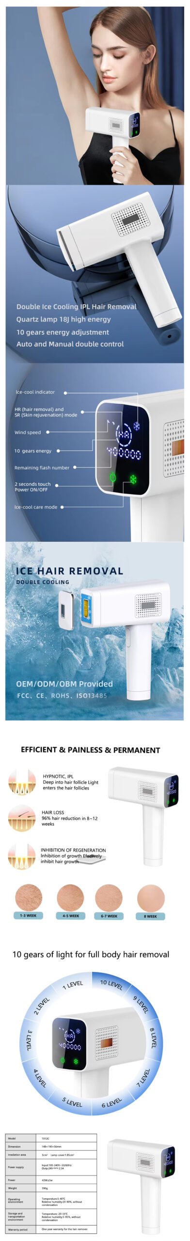 ICE cooling IPL system, Advanced IPL technology, Hair growth reduction, Smooth hair-free skin, Home use design, 400,000 flashes lifespan, Quartz lamp tube, Long-term use, 10 adjustable power levels, 10 gear intensity, Smart energy control, Skin tone adaptability, Ergonomic handle design, Comfortable grip, Body curve fitting, Auto mode operation, Manual mode operation, Face & bikini auto mode, Underarm auto mode, Full body manual mode, Low pain experience, Skin cooling protection, Gentle treatment, Safe energy output