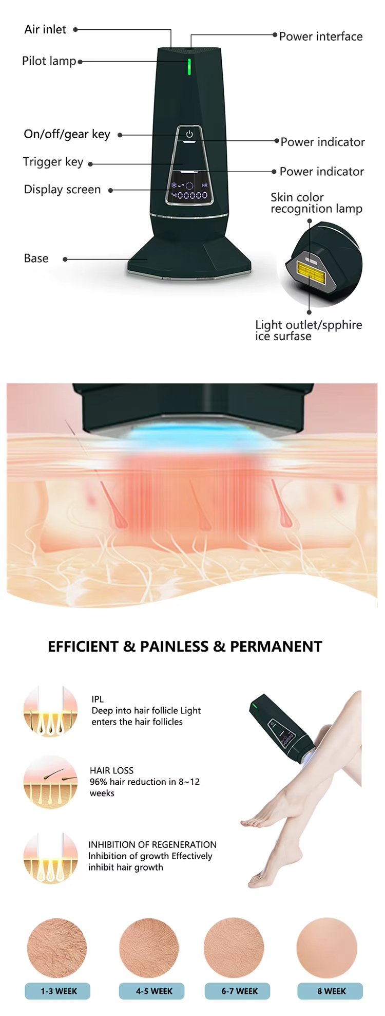 IPL hair removal, Skin rejuvenation, Hair growth inhibition, Smooth skin care, Pore refinement, Skin tone improvement, Long-term beauty maintenance, Home beauty treatment
