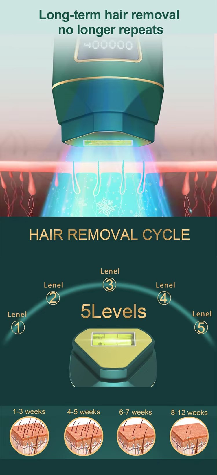 2-in-1 IPL system, Hair removal mode (HR), Skin rejuvenation mode (SR), Dual beauty functions, Melanin targeting technology, Hair follicle inhibition, Permanent hair reduction, Clear skin effect, Break hair regrowth cycle, Advanced IPL technology, Quartz lamp tube, 400,000 flashes lifespan, Long-term use, Multi-user friendly, Salon-level results, Home use design, Privacy beauty care, Optional ICE cooling, Skin soothing effect, Low pain experience, Comfortable treatment